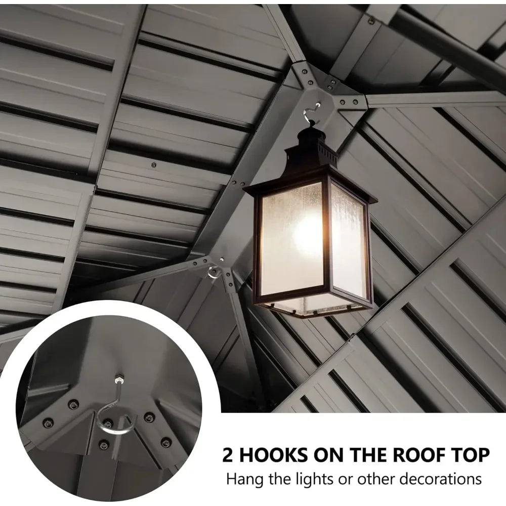️USEFUL ACCESSORIES: The gazebo equipped with top hooks in the middle of the roof of the gazebo that you can use to hang lights and decorations to boost your pleasant outdoor time. Hard Top Gazebo comes with removable curtains ensure UV and rain protection. Let you enjoy great privacy while having full airflow and a wide view of the outdoors