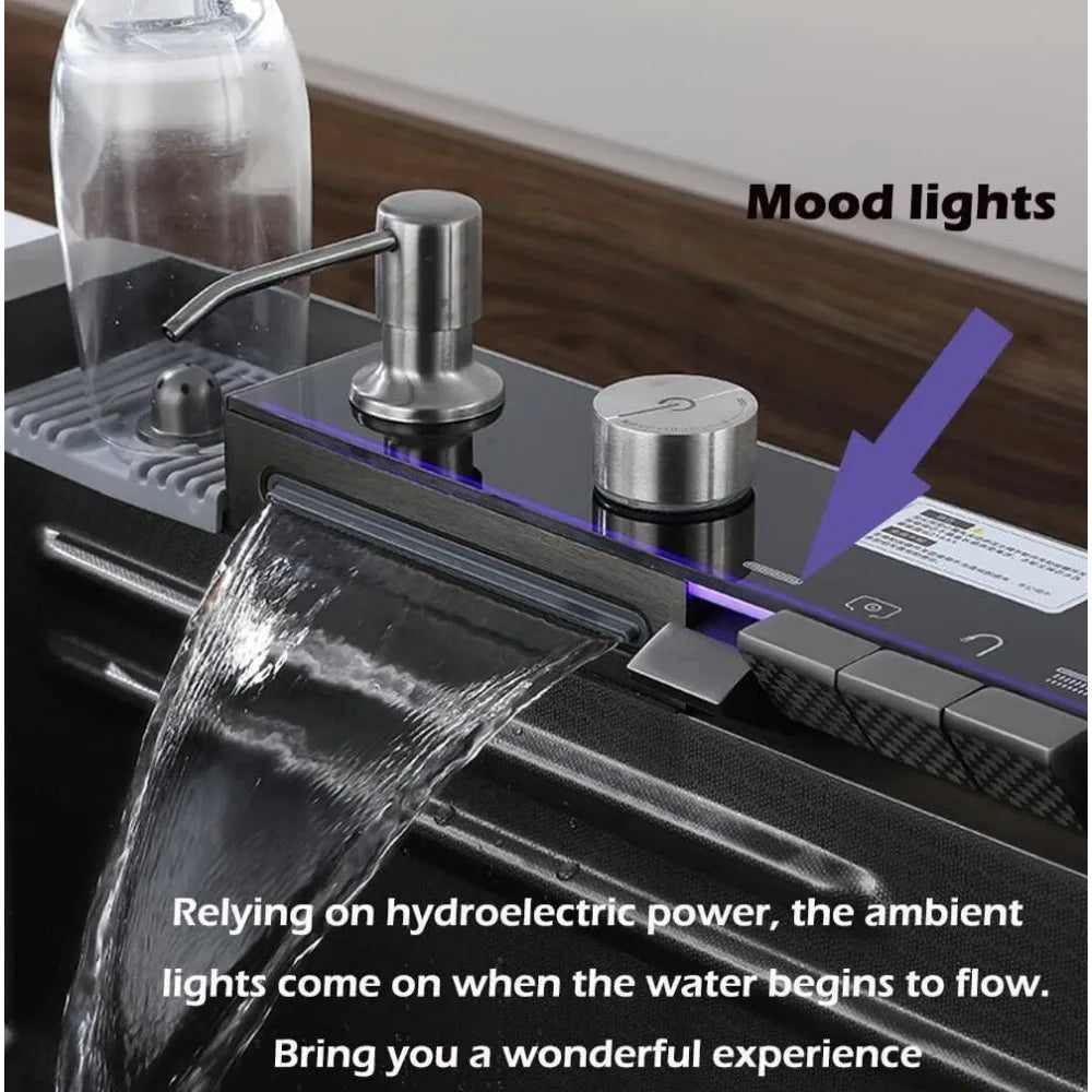 Transform your kitchen experience with the RBXC 33x22 Inch Nano Black Kitchen Single Bowl Sink featuring a sleek Flying Rain Waterfall design.