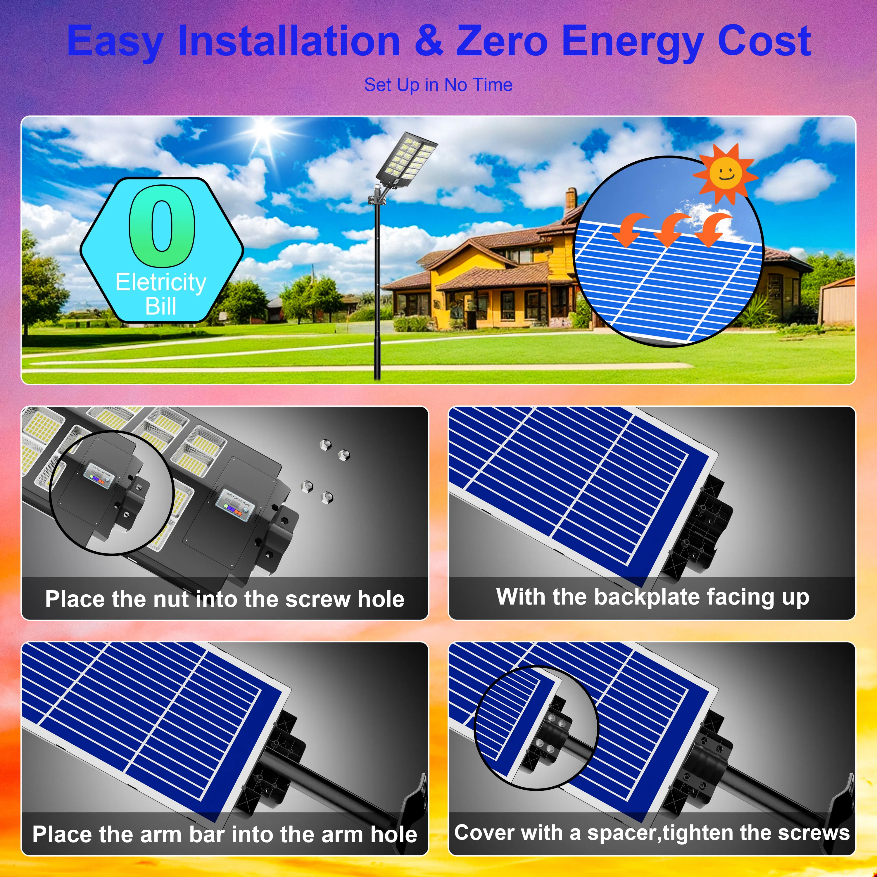 This outdoor solar light is equipped with high-efficiency solar panels that automatically absorb sunlight during the day and convert it into electricity, eliminating the need for an external power source. It is energy-saving and environmentally friendly, ensuring reliable operation even in cloudy or low-light conditions.