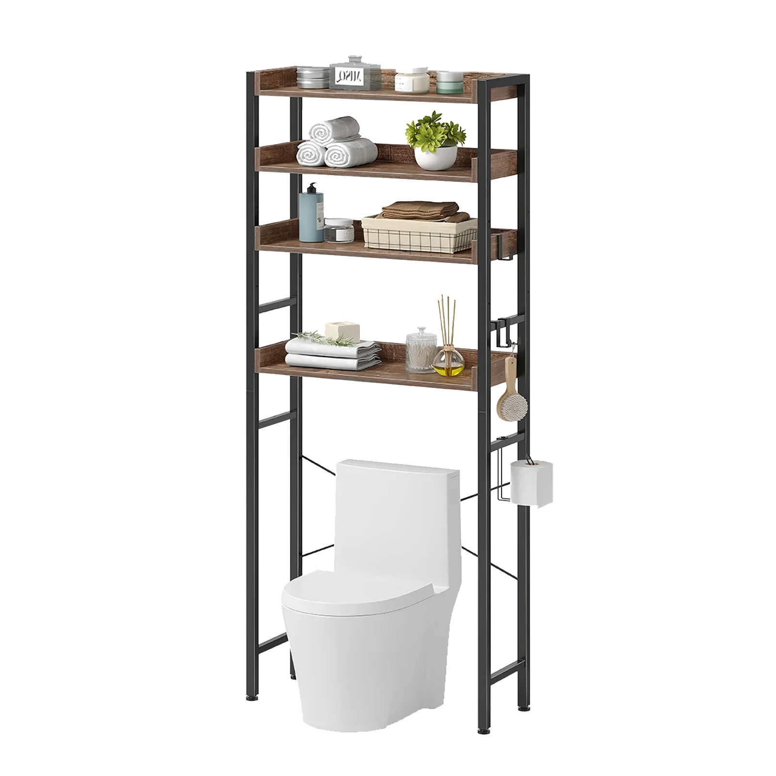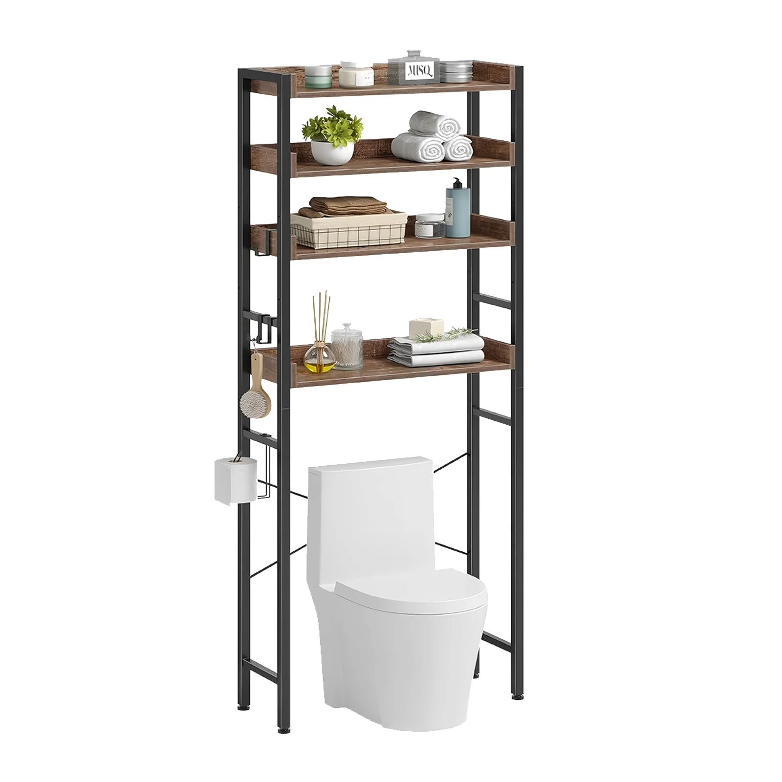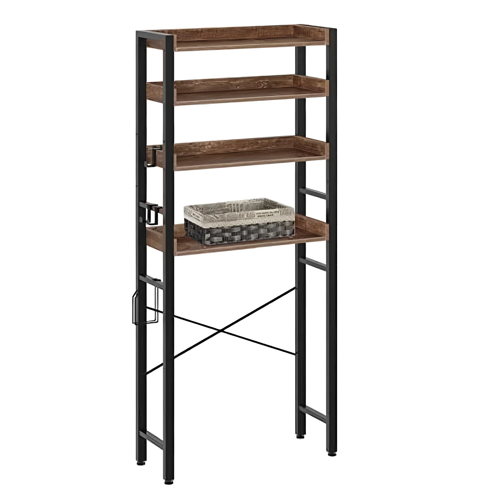This 4-tier over-the-toilet storage rack offers a smart solution for compact spaces. Featuring four spacious shelves and four practical hooks, it maximizes storage possibilities. Keep daily essentials, plants, and cleaning tools neatly organized. The innovative X-shaped support structure ensures stability and durability for worry-free use. Designed with an industrial minimalist aesthetic, its rustic wood panels and black metal frame combine functionality and elegance, adding a unique touch to your bathroom. Versatile in application, it fits seamlessly into bathrooms, living rooms, or offices, serving as a storage assistant, plant display stand, or laundry companion, bringing creativity and convenience to your living space.