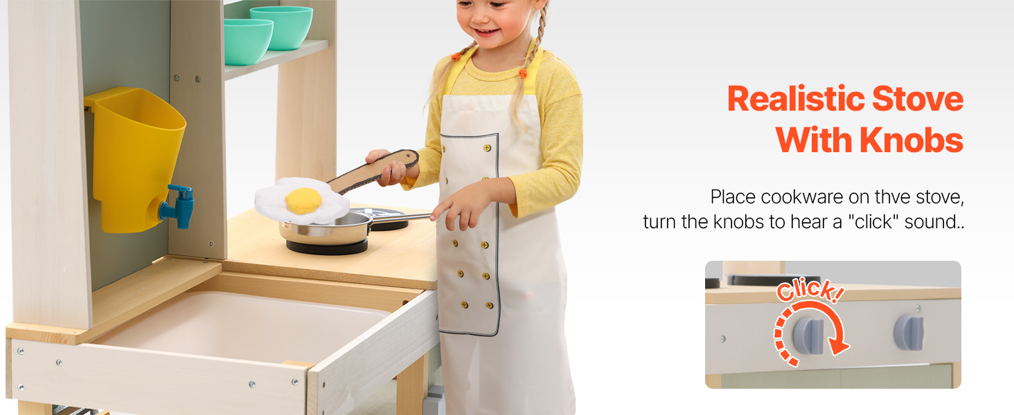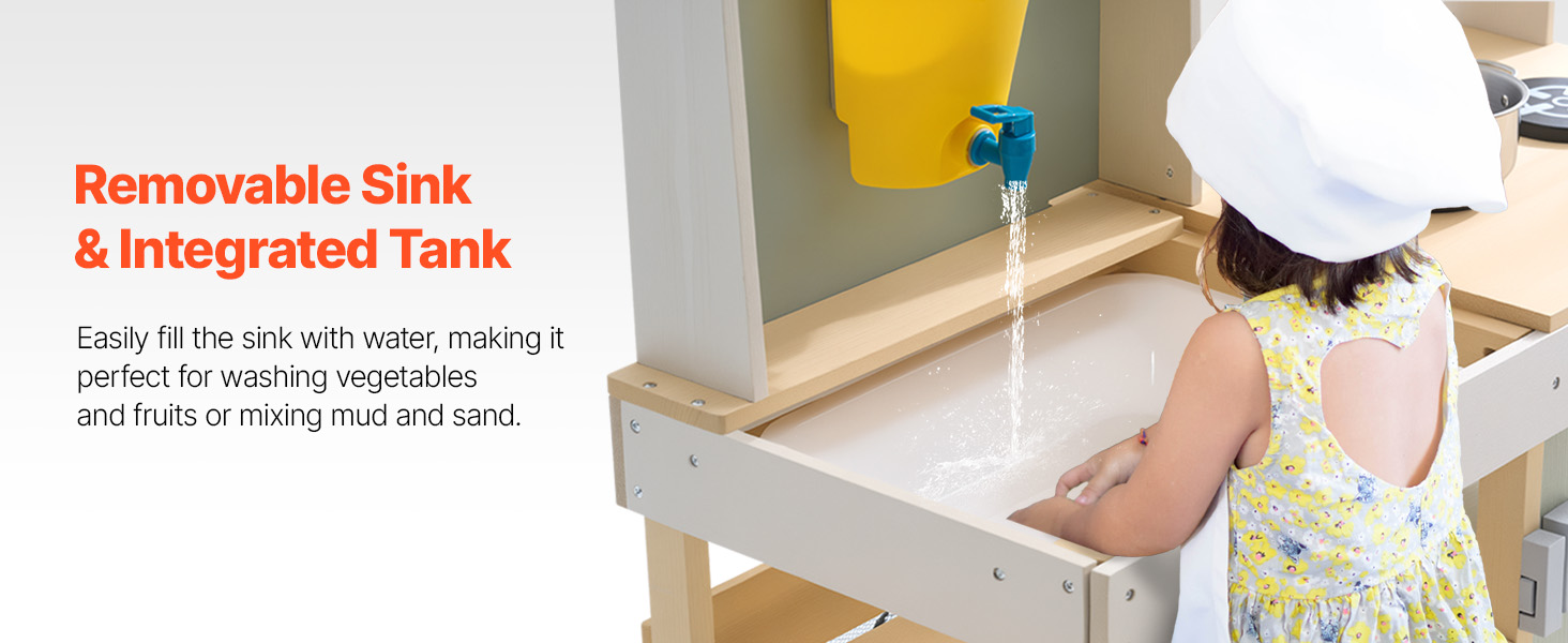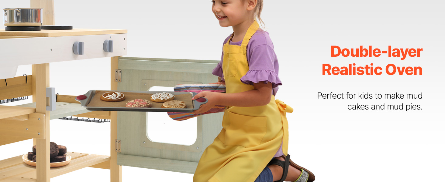Realistic Kitchen Play Design: Let your little one imitate cooking with dirt just like a real chef! Little chefs can use the removable sink with integrated water tank and faucet to clean dishes, turn the knobs on the simulated stove to cook, and use the dual-layer oven to bake "mud pies." The endless kitchen scenarios will ignite your child's imagination and creativity