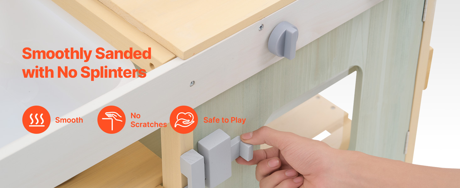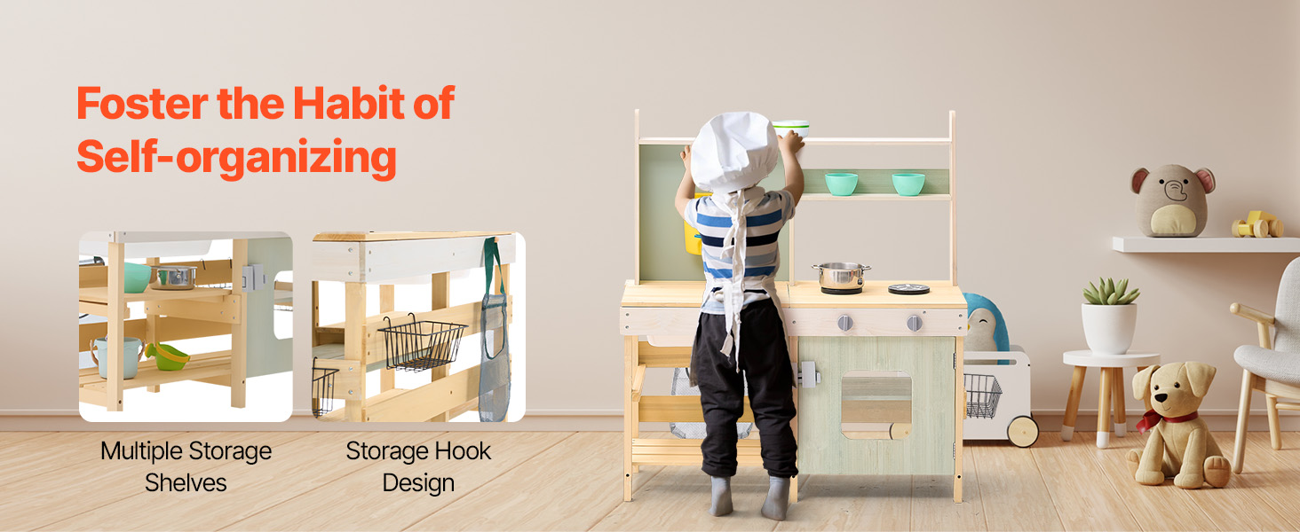 Promote Independence: The wooden toy play kitchen set features various storage cabinets, providing large storage space and hooks so kids can organize and store items according to their preferences. The sliding door latch on the cabinet prevents doors from swinging open and can also serve as a handle, making it easier for kids to open the doors and access their items