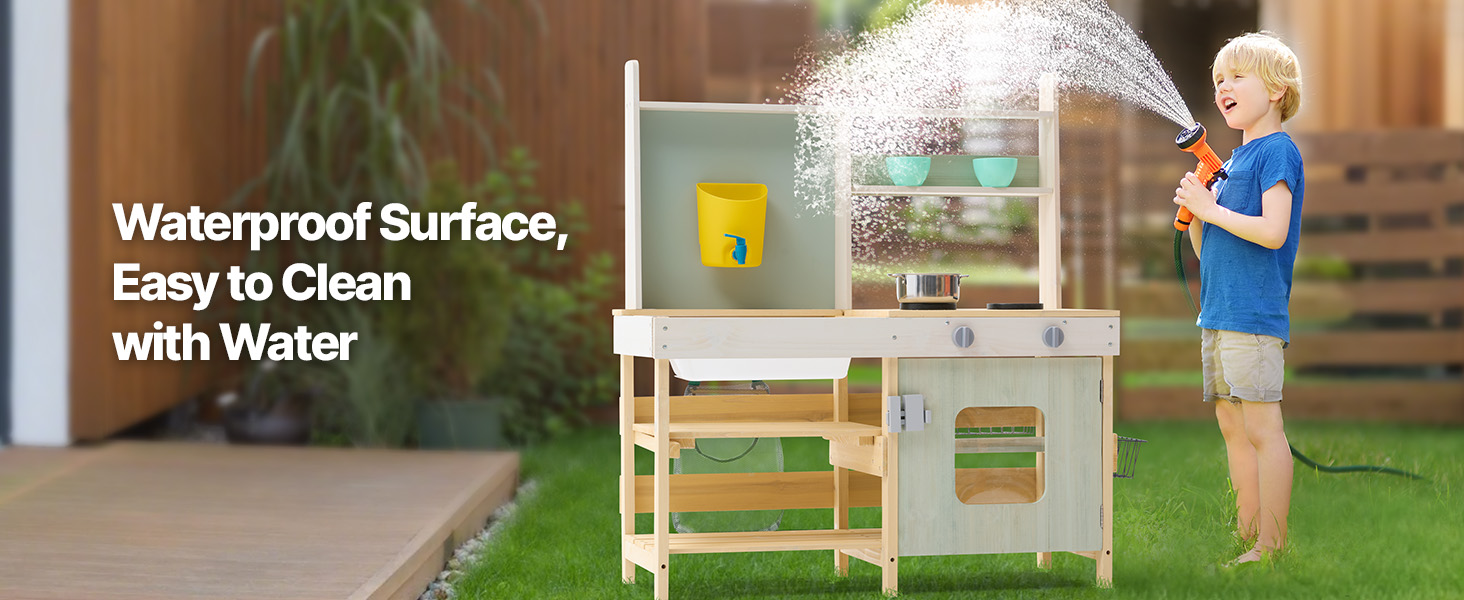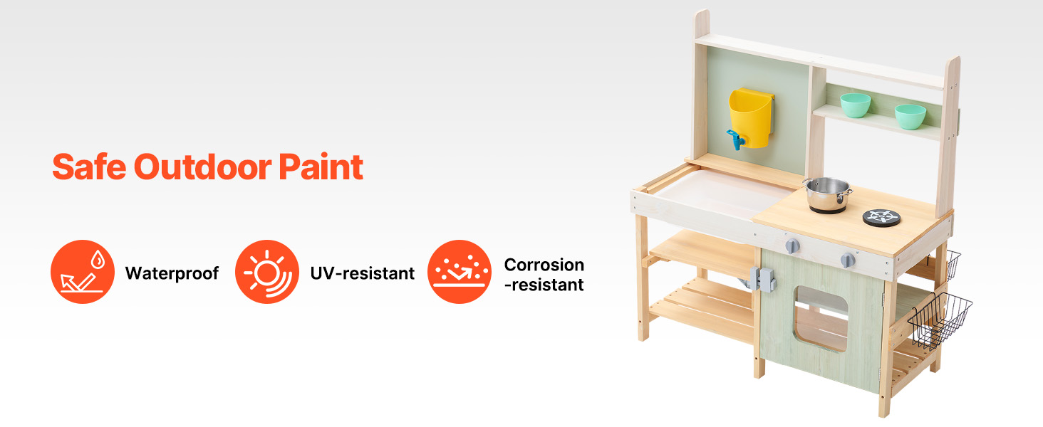 Waterproof Surface, Perfect for Outdoor Use: The outdoor mud kitchen features a waterproof and corrosion-resistant surface, treated with outdoor-grade paint. It is built to withstand harsh weather and extreme conditions, making it perfect for outdoor use in gardens, backyards, or lawns. This kids grocery store playset market can easily handle rain and intense sunlight, ensuring durability and extending its lifespan
