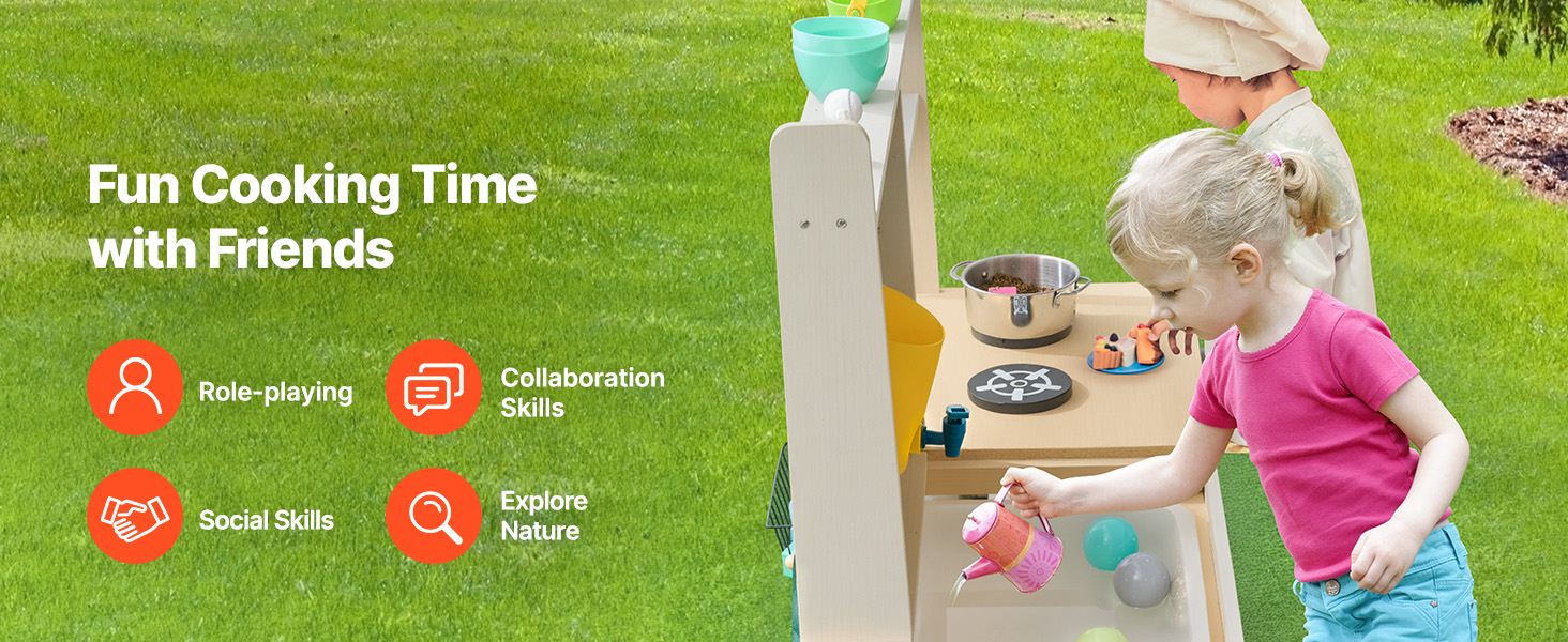A Fun Developmental Gift: This pretend play outdoor kitchen is perfect for birthdays or holiday gifts for children, whether for boys or girls! With a 20.47-inch countertop height, kids can easily reach and organize their play items, helping improve hand-eye coordination. The spacious work area allows children to play with friends, explore the joys of nature outdoors, and improve collaboration and social skills